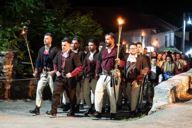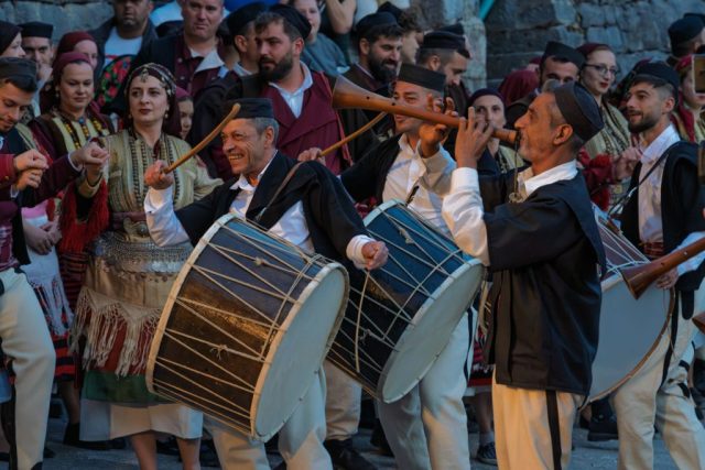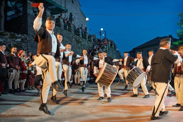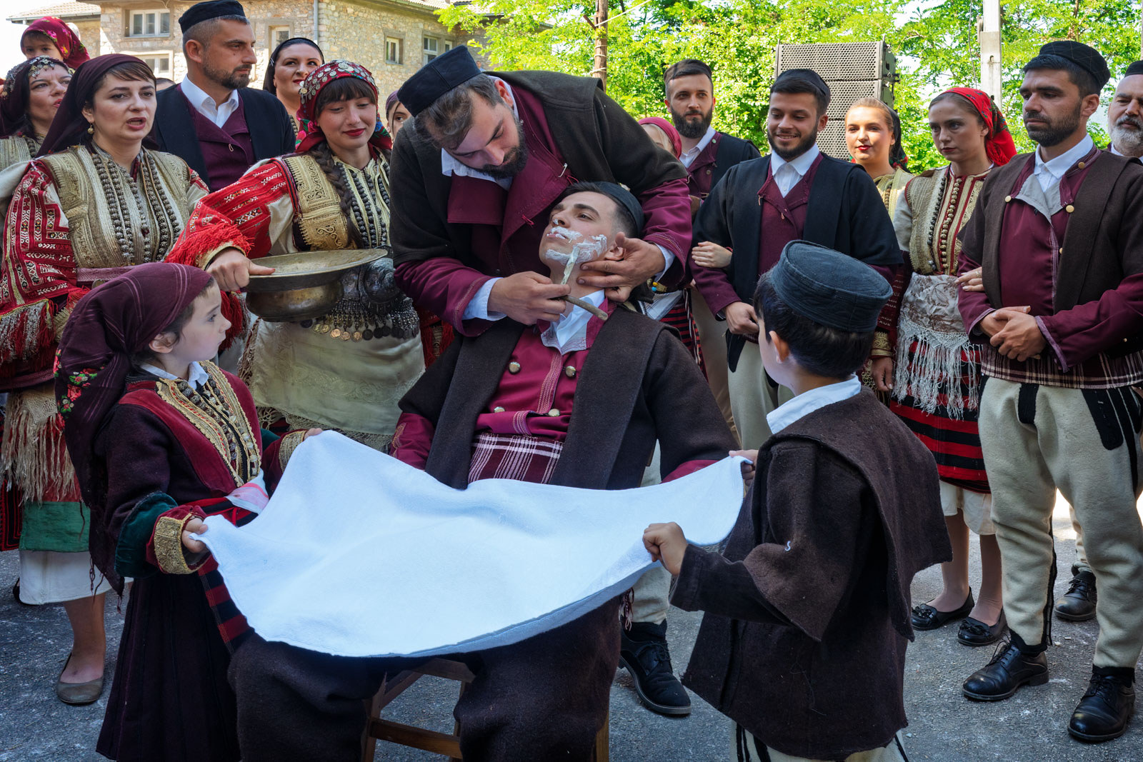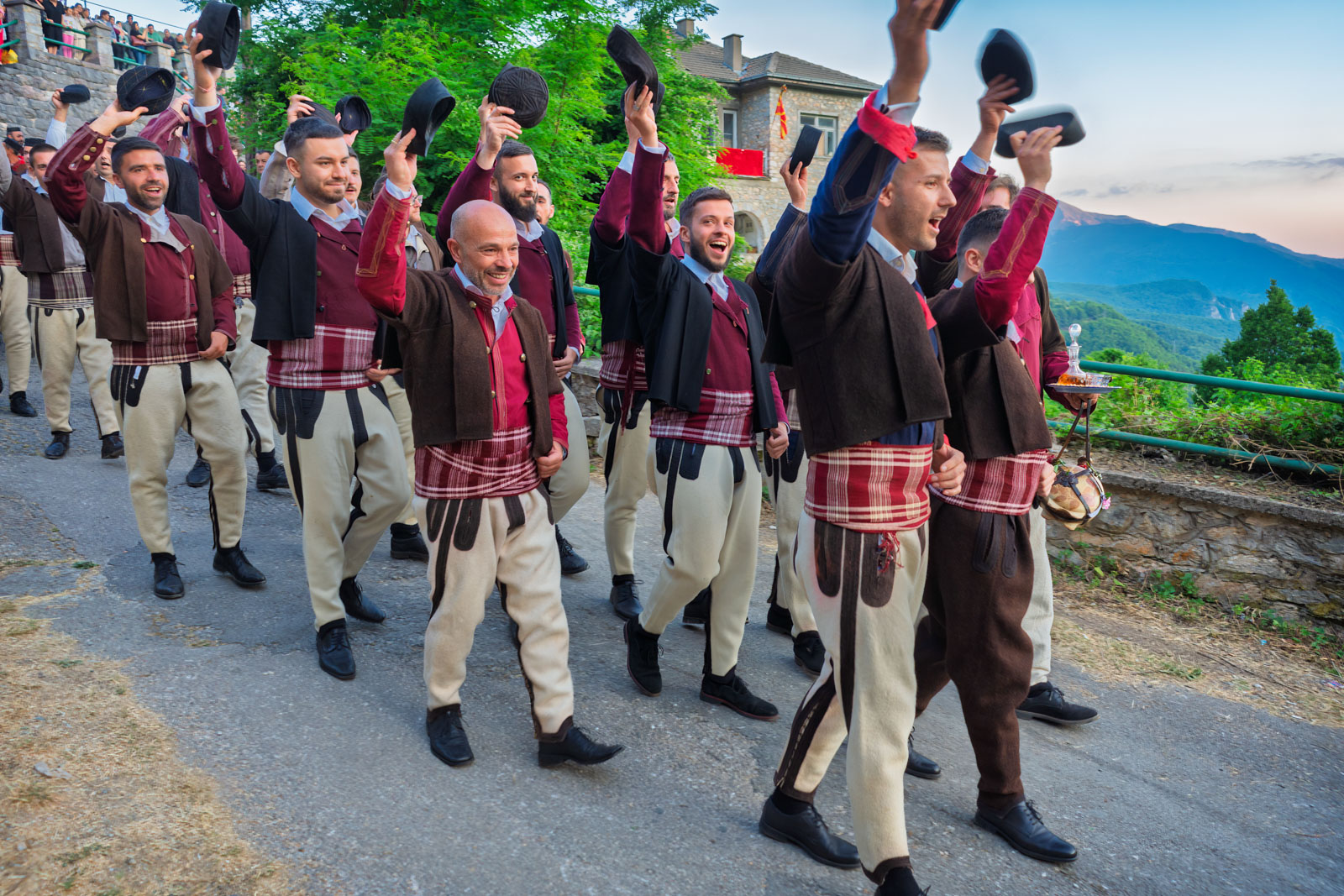 The festivities begin on Saturday evening, when three gunshots are fired from the groomโs balcony. Then the groom, his brother, and friends descend in procession to meet the musicians, who are already playing as they climb up from Hotel Neda. The two groups meet midway and ascend together toward the square, where music accompanies traditional dances. A procession of marriage mediators then proceeds to the brideโs home, escorting her to visit three fountains where she fills a jug with water โ a symbolic act of purity and fertility.