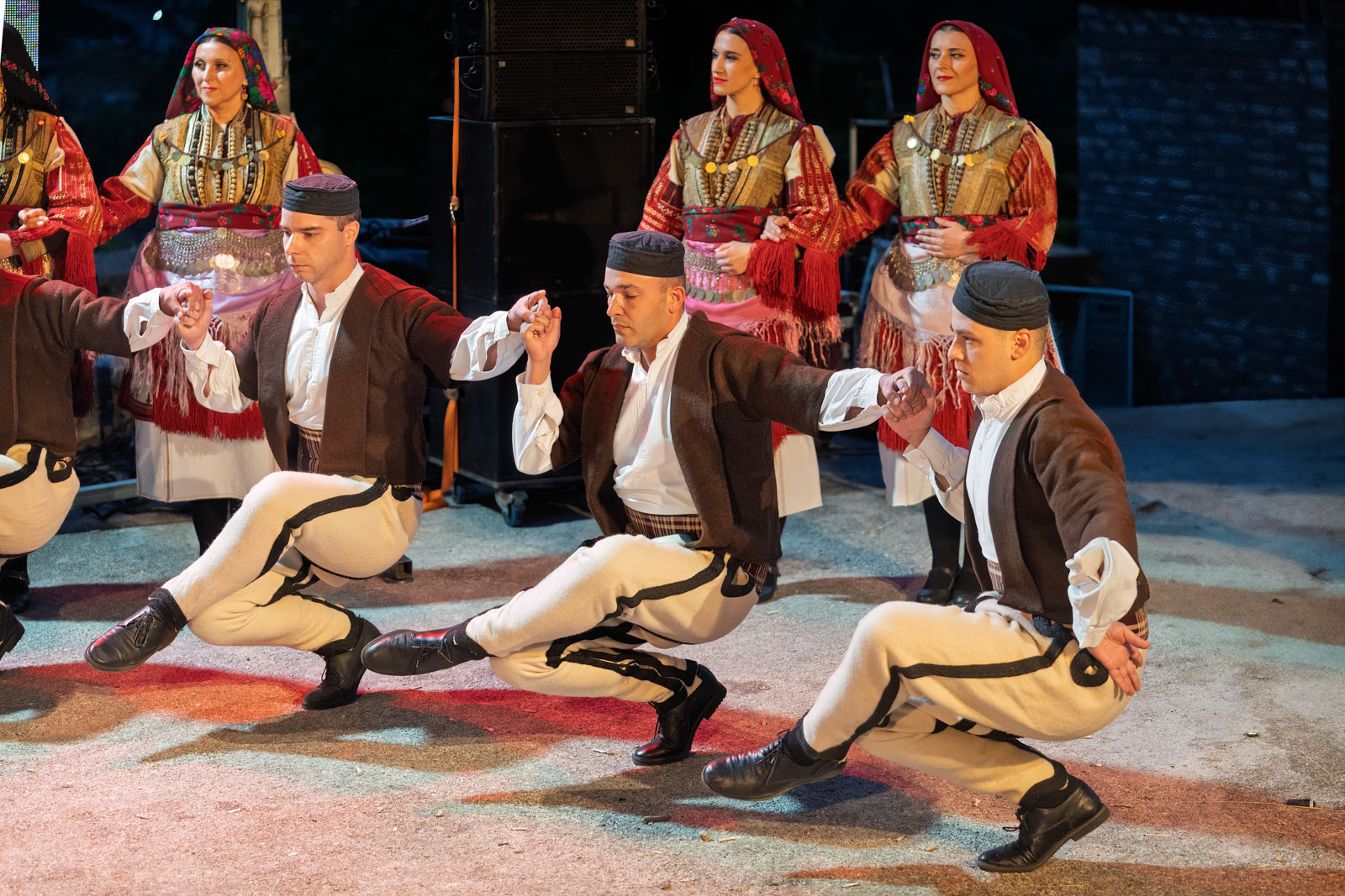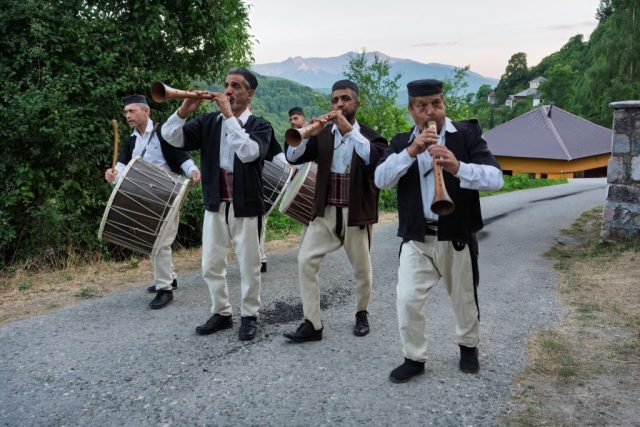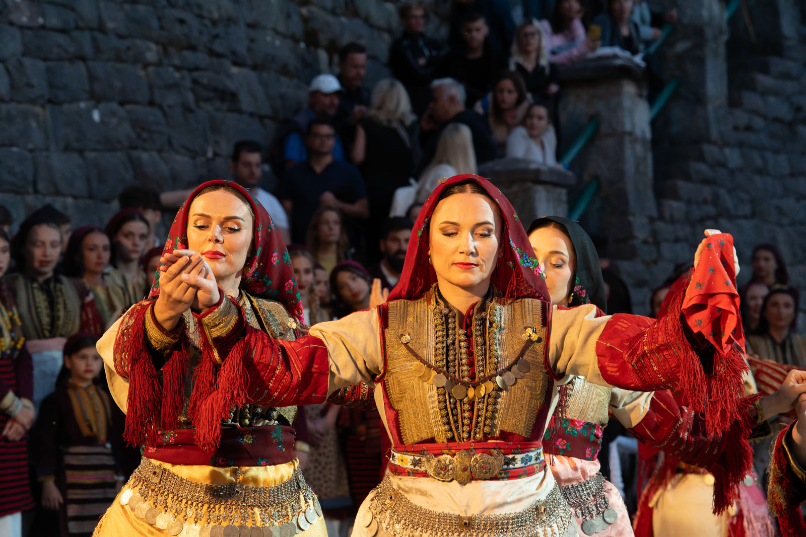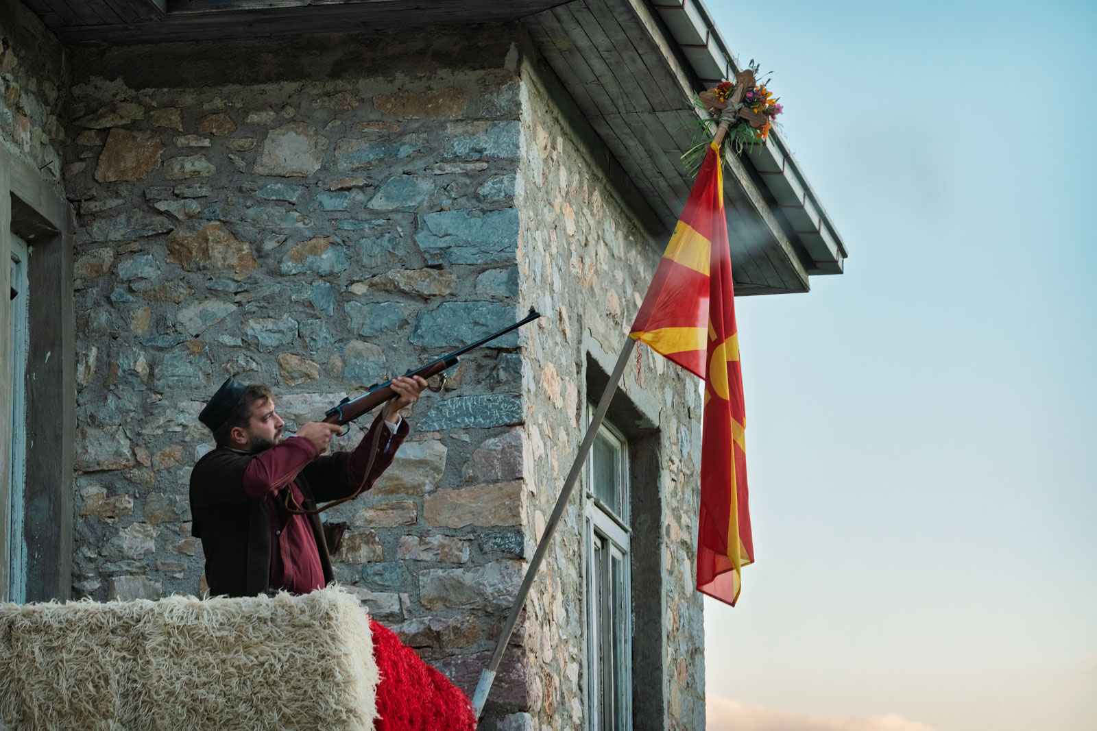 The festivities begin on Saturday evening, when three gunshots are fired from the groomโs balcony. Then the groom, his brother, and friends descend in procession to meet the musicians, who are already playing as they climb up from Hotel Neda. The two groups meet midway and ascend together toward the square, where music accompanies traditional dances. A procession of marriage mediators then proceeds to the brideโs home, escorting her to visit three fountains where she fills a jug with water โ a symbolic act of purity and fertility.