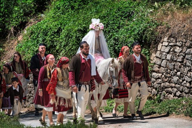 At last, the bride, dressed in rich traditional garments, mounts a horse. At the center of a procession led by a flag-bearer on horseback, she is taken to the groomโs house, where she is formally welcomed. From there, the couple proceeds to the church for the religious ceremony, followed by music and dancing.